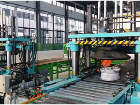 自動式去進膠口鑽探機工作內容:成形後的輪圈毛胚,由輔助輥道協助下送進輪型自動檢索係統軟件(測高模塊)並出示的輪型編號,鑽機全自動解決後確認每一輪圈的生產加工主要參數。輪圈抵達轉孔工裝夾具後被全自動調心壓料模塊緊抱並精準定位後轉孔锪平上表層。生產加工完的輪圈再曆經消除鋁屑工裝夾具,將粘附的鋁屑消除掉並吹掉很多的切削液再離去進膠口鑽。
